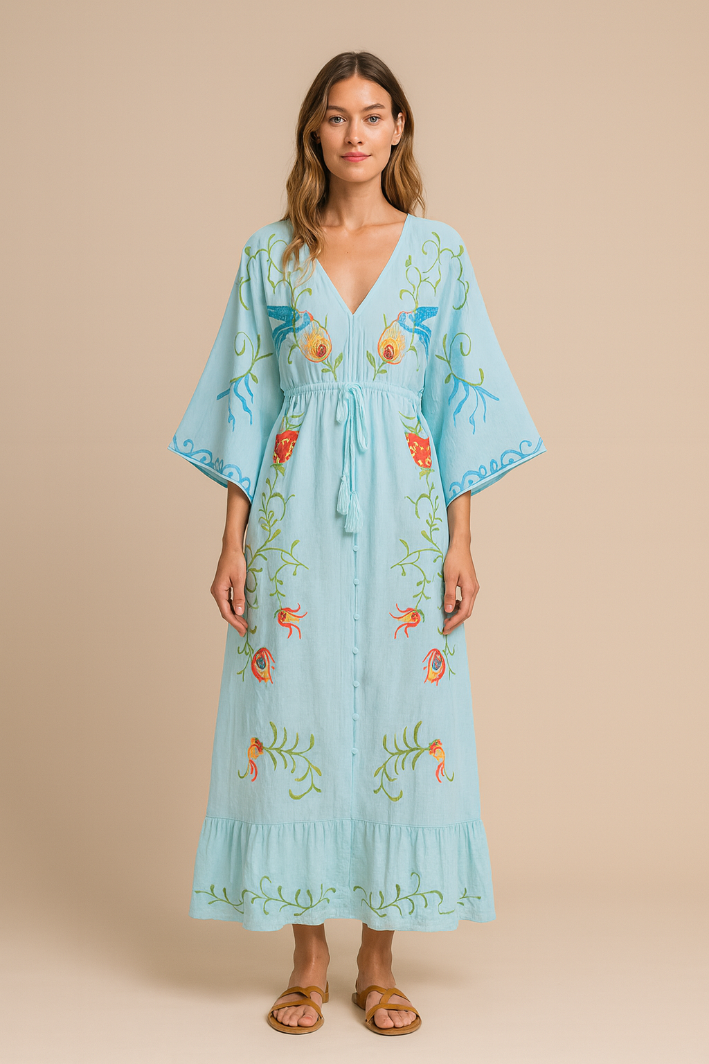 A light-blue coastal-boho maxi that feels like sea breeze—flowing silhouette with vivid embroidery and tasselled ties.